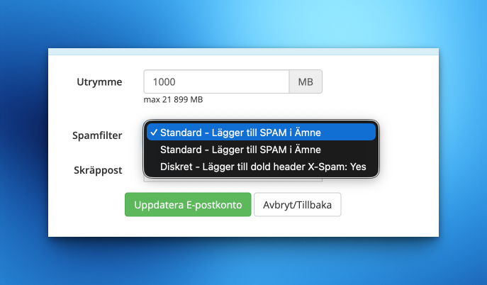 I våra tjänster WebbMotell och Enkel E-Post försöker själva e-postservern avgöra om inkommande e-post är skräp/phishing/malware etc. Processen för att avgöra detta är mycket avancerad. När e-postservern upptäcker att ett brev är skräp kan följande inträffa: