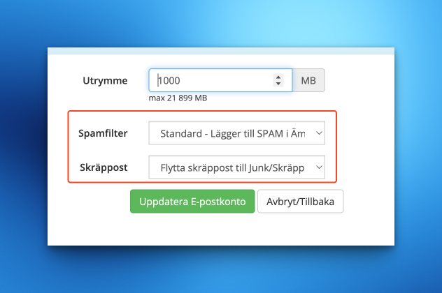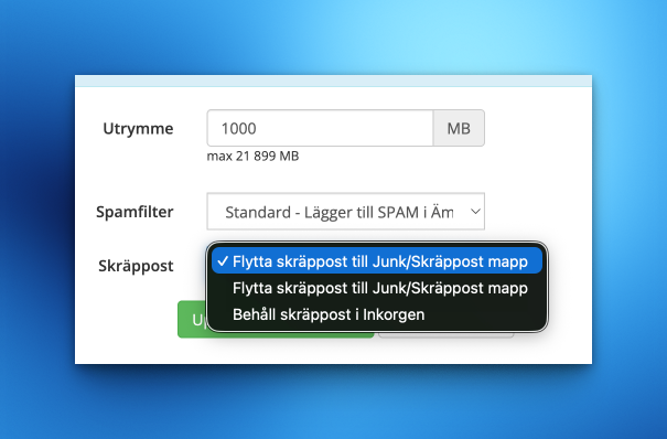 Med valet Skräppost kan ni ange om nu vill att skräppost automatiskt skall läggas i mappen Junk.