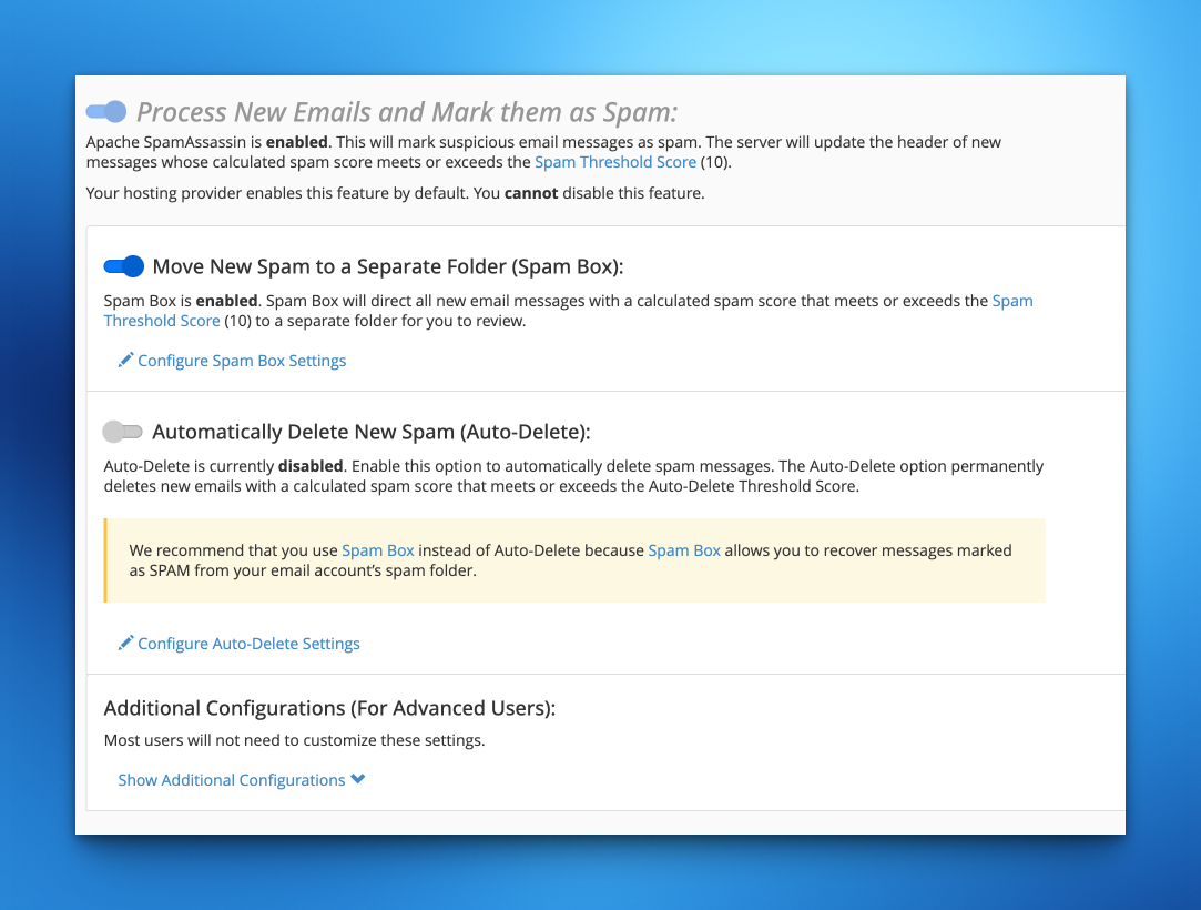 Kontrollpanelen cPanel har en liknande process som beskriven ovan. Här heter dock inte skräpmappen Junk, utan här heter den spam.